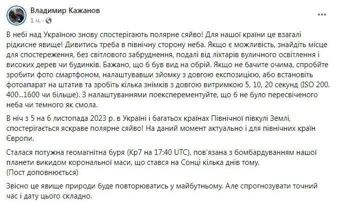 "В ночь с 5 на 6 ноября в Украине, как и во многих странах Северного полушария Земли, наблюдается яркое северное сияние. Произошла мощная геомагнитная буря, связанная с бомбардировкой нашей планеты выбросом корональной массы, произошедшим на Солнце несколько дней назад", — написал ученый.