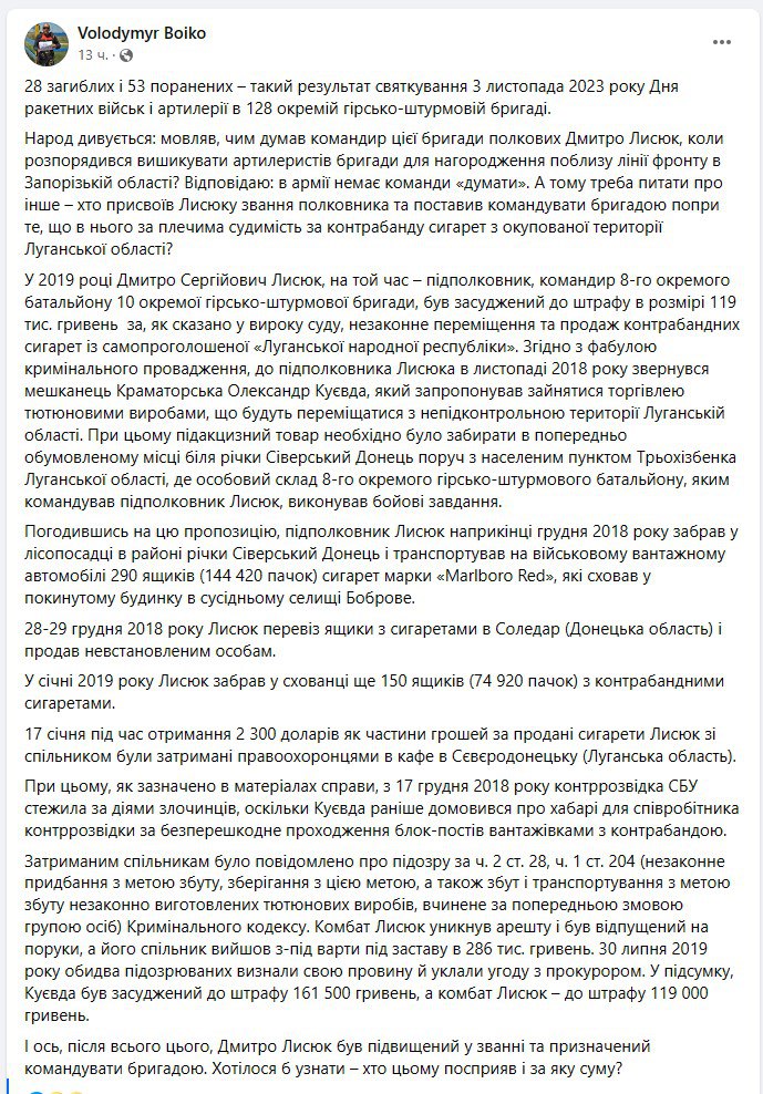 Комбриг 128-й штурмовой бригады Дмитрий Лысюк, бойцы которого попали под российский ракетный удар 3 ноября во время организованного командованием подразделения "торжественного построения", ранее был судим за контрабанду сигарет.