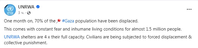 "Прошел месяц, 70% населения Газы перемещены", - отметило агентство, подчеркнув, что "гражданские лица подвергаются принудительному перемещению и коллективному наказанию".
