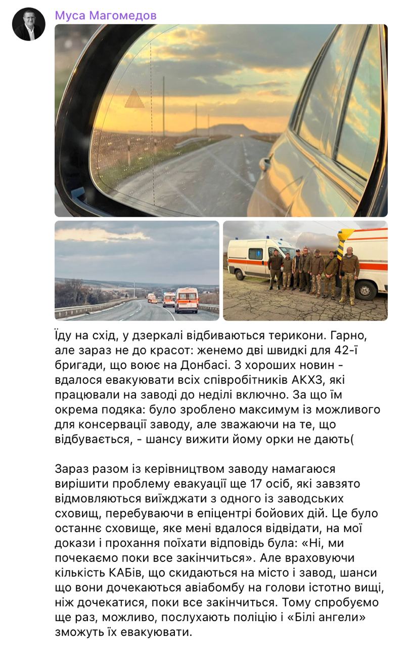 "Учитывая количество КАБов, которые сбрасывают на город и завод, шансы, что они дождутся авиабомбы на головы, существенно выше, чем дождаться, пока все закончится", - прокомментировал решение сотрудников нардеп.