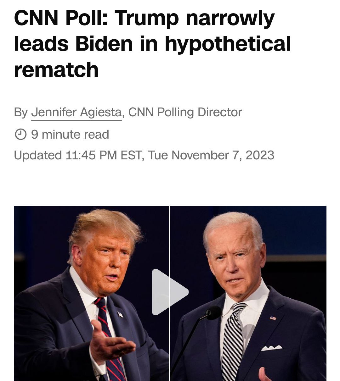 Согласно исследованию, проведенному по заказу CNN, Трамп набирает 49%, а Байден 45%.