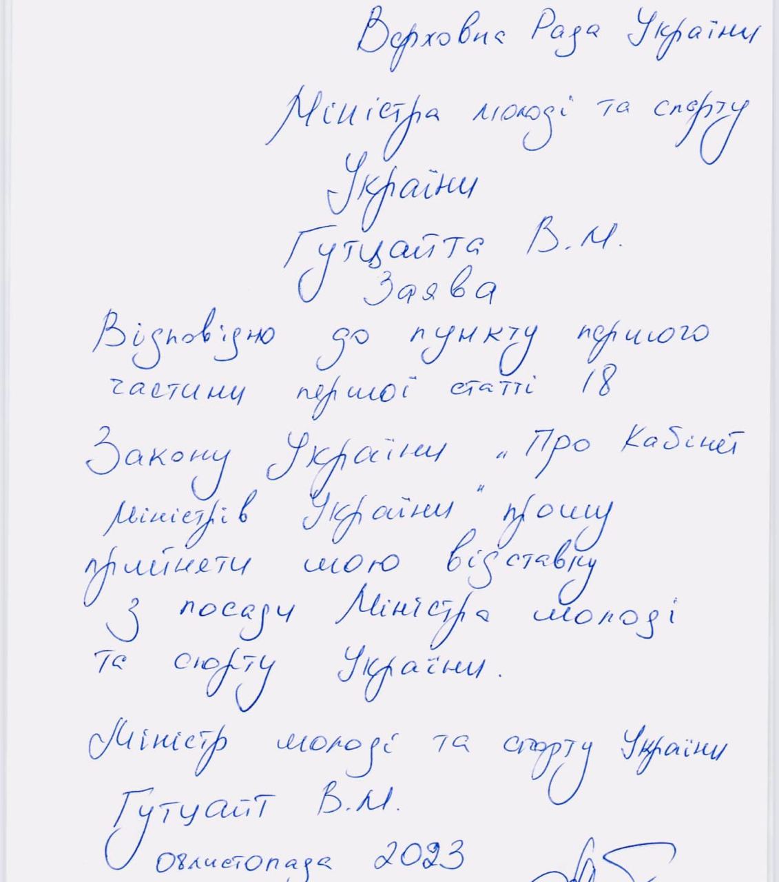 "В Верховную Раду Украины поступило заявление министра молодежи и спорта Украины Гутцайта В. М. об отставке. Заявление будет рассмотрено в ближайшее время", - написал он.