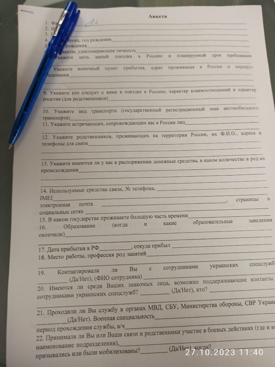 В числе вопросов: где проживают постоянно и находятся большую часть времени, работали ли на госслужбе в Украине, были ли в ВСУ, есть ли знакомые в спецслужбах, владеют ли информацией о деятельности украинских радикалов, были ли судимы, поддерживают ли украинскую власть и проведение "специальной военной операции" (так официально в России называют войну в Украине).
