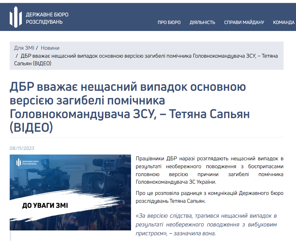 В ГБР несчастный случай считают основной версией гибели помощника Залужного