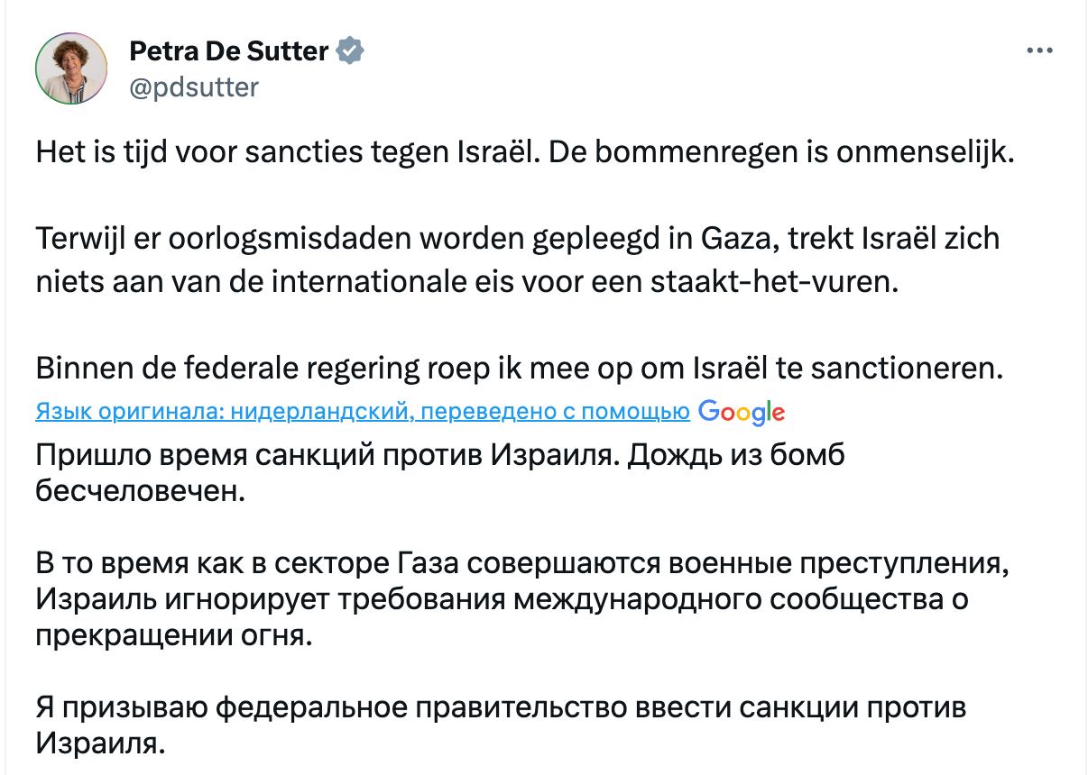 "Пришло время санкций против Израиля. Дождь из бомб бесчеловечен. В то время, как в секторе Газа совершаются военные преступления, Израиль игнорирует требования международного сообщества о прекращении огня. Я призываю федеральное правительство ввести санкции против Израиля", - сказано в посте Петры Де Суттер.