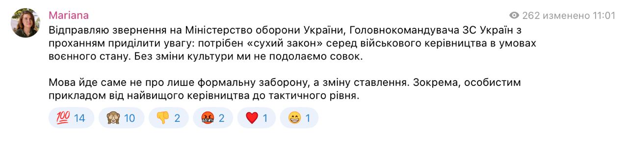 Народный депутат из фракции "Слуги народа" Марьяна Безуглая призвала ввести сухой закон среди военного руководства в условиях военного положения.