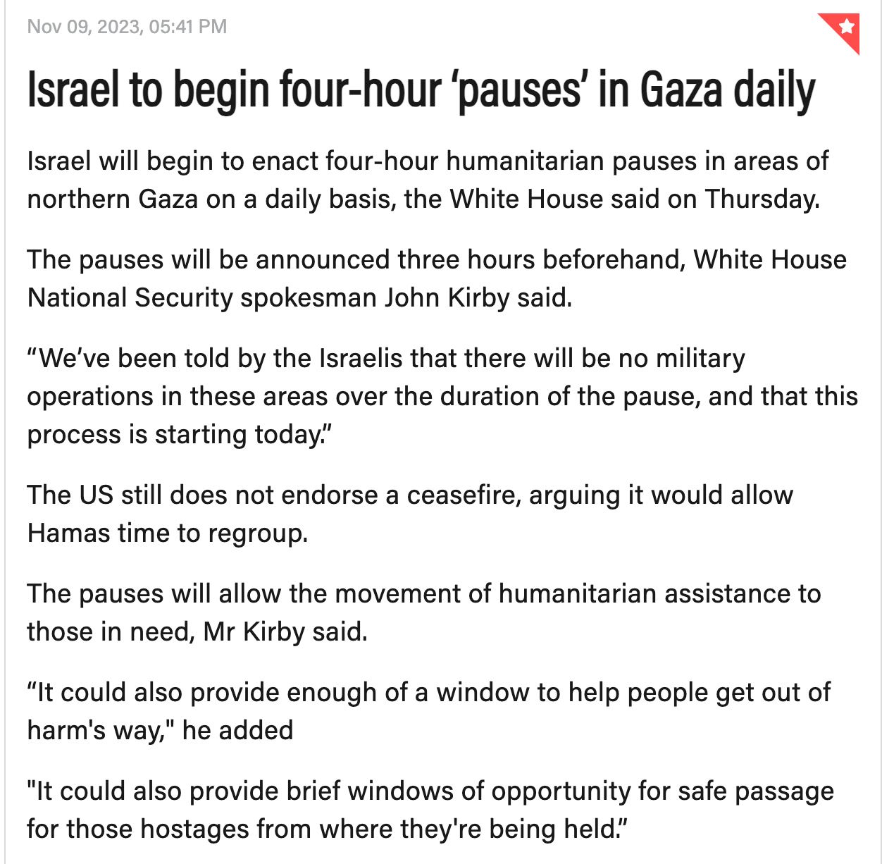 "Израильтяне сказали нам, что в течение паузы в этих районах не будет военных операций, и что этот процесс начинается сегодня", - цитирует Кирби The National News.