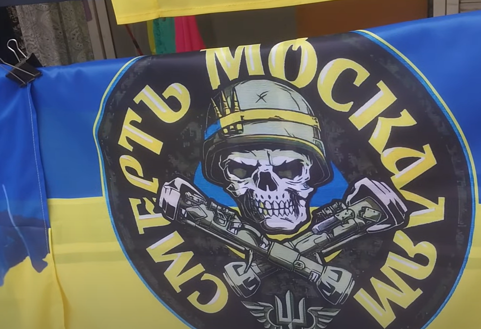 На рынке среди продуктов представлен огромный выбор украинских флагов — как ВСУ, там и добровольческих батальонов. Цена — 275 гривен.