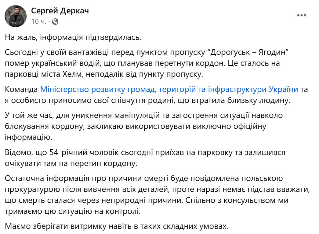 "Окончательная информация о причинах смерти будет сообщена польской прокуратурой после изучения всех деталей, однако пока нет оснований полагать, что смерть произошла по неестественным причинам", – отметил Деркач.