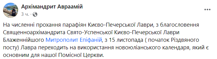 "По многочисленным просьбам прихожан Киево-Печерской лавры, по благословению священноархимандрита Свято-Успенской Киево-Печерской лавры митрополита Епифания, с 15 ноября (начало рождественского поста) лавра переходит на использование новоюлианского календаря, который является основным для нашей поместной церкви", - говорится в сообщении.