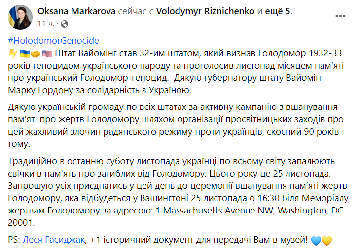 Кроме того, дипломат опубликовала документ о признании Голодомора властями Вайоминга геноцидом украинцев.
