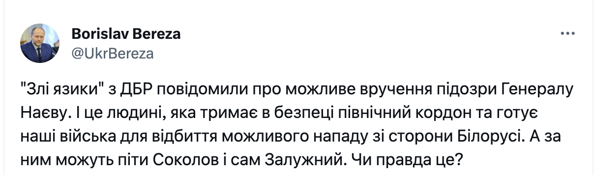 "Злые языки" из ГБР сообщили о возможном вручении подозрения Генералу Наеву. И это человек, который держит в безопасности северную границу и готовит наши войска для отражения возможного нападения со стороны Беларуси. А за ним могут последовать Соколов и сам Залужный. Правда ли это?", - написал Береза в Х.