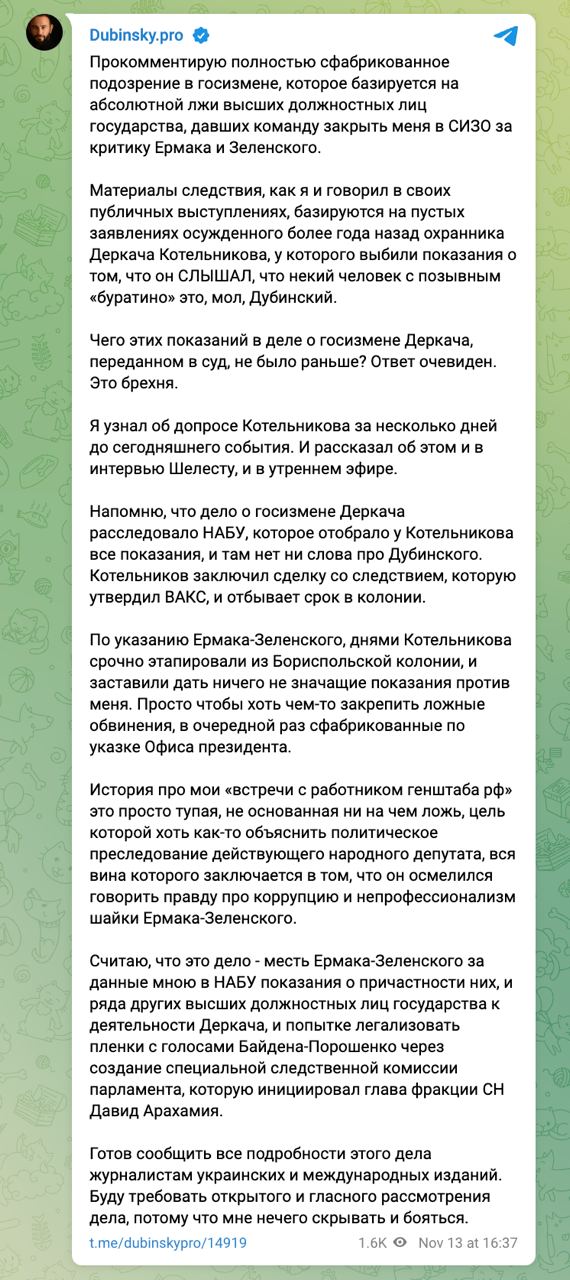 "Материалы следствия, как я и говорил в своих публичных выступлениях, базируются на пустых заявлениях осужденного более года назад охранника Деркача Котельникова, у которого выбили показания о том, что он СЛЫШАЛ, что некий человек с позывным "буратино" это, мол, Дубинский. Чего этих показаний в деле о госизмене Деркача, переданном в суд, не было раньше? Ответ очевиден. Это брехня", - пишет нардеп.