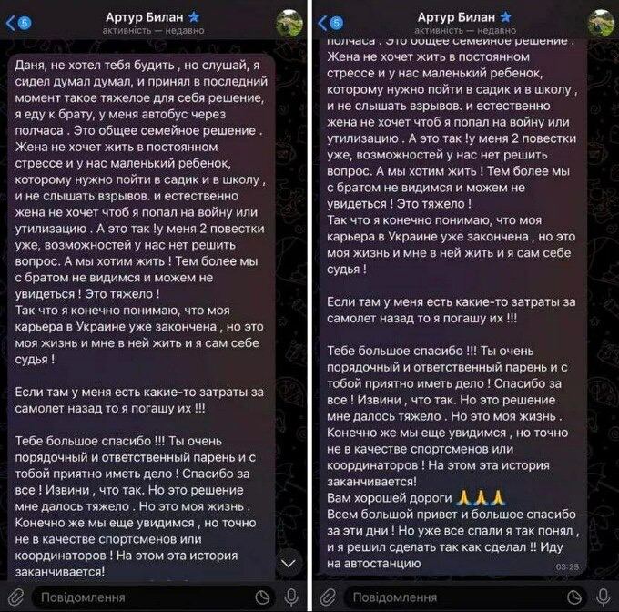 Об этом сообщил капитан украинской сборной Даниил Лясов, опубликовав в соцсетях скриншот сообщения Билана.