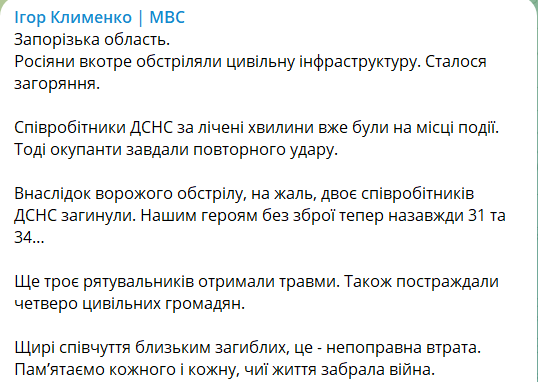 "Россияне в очередной раз обстреляли гражданскую инфраструктуру. Произошло возгорание. Сотрудники ГСЧС в считанные минуты уже были на месте происшествия. Тогда оккупанты нанесли повторный удар", - написал он.