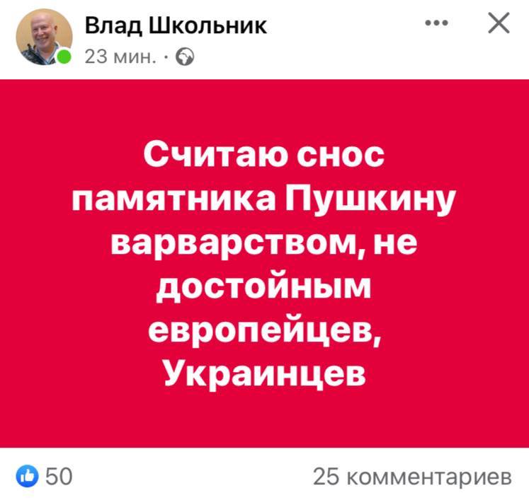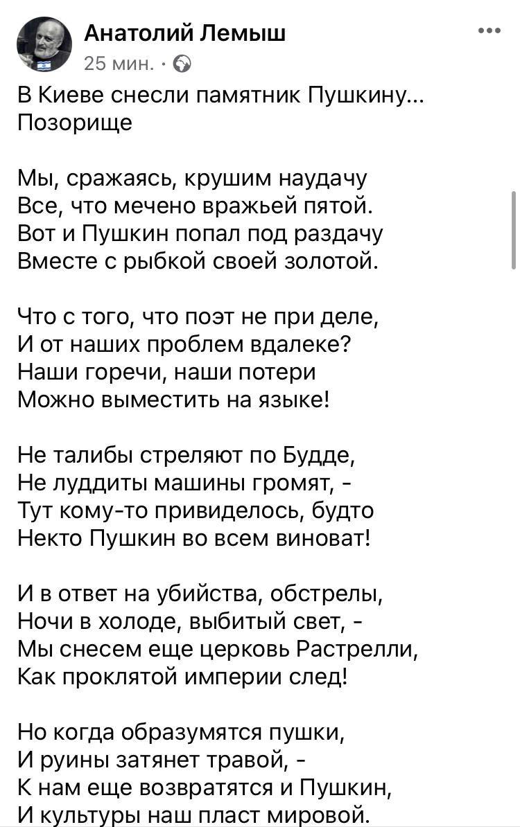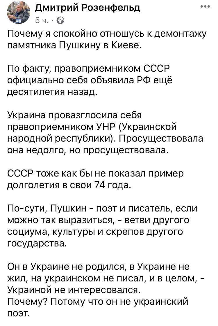 Многие осуждают демонтаж, называют это "позорищем". Так, один из пользователей ФБ напоминает, что многие украинские писатели, например, Котляревский, в имперское время были на службе в российской армии.