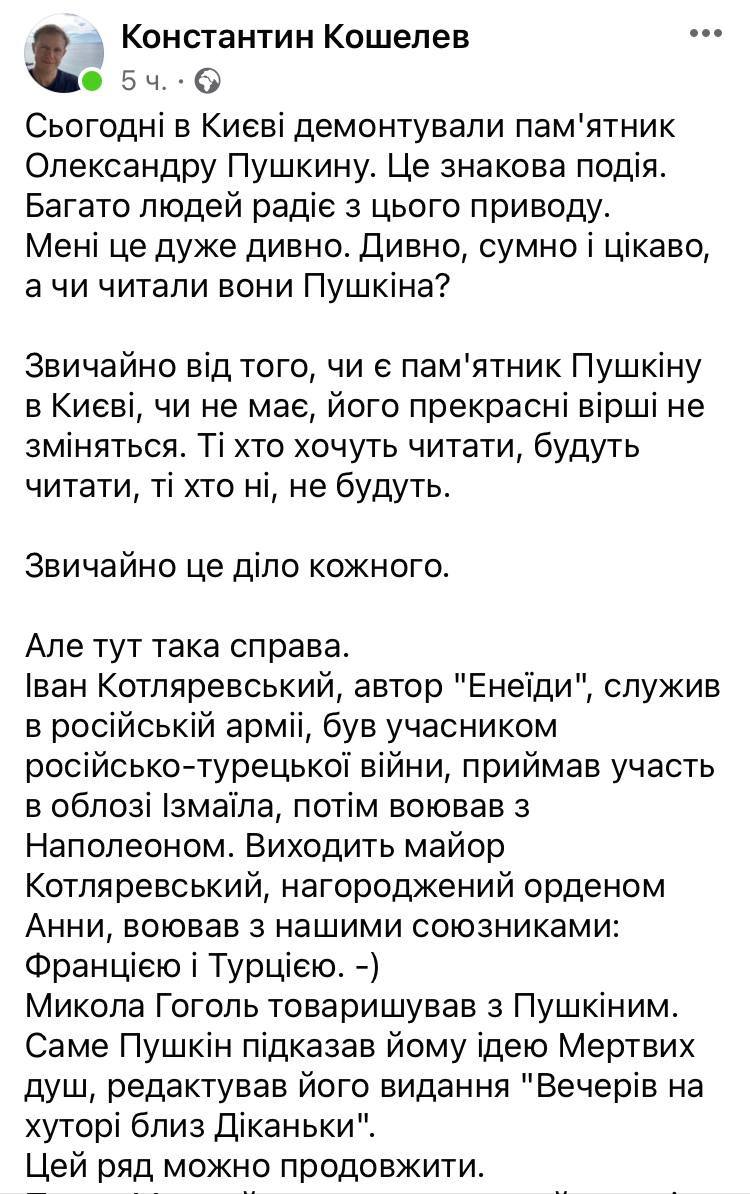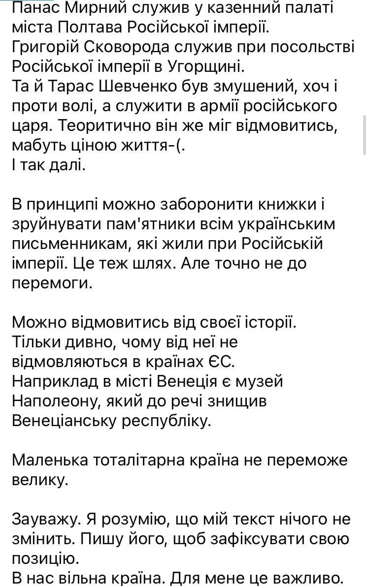 "В принципе, можно запретить книжки и разрушить памятники всем украинским писателям, которые жили при Российской империи. Это тоже путь. Но точно не к победе... Маленькая тоталитарная страна не победит большую", - написал Константин Кошелев.