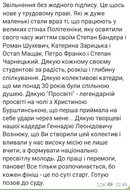 "Увольнение без подписи. Это что-то новое в трудовом праве. Как же очень маленькие стали сразу работающие в больших стенах Политехники, которую освятили в свое время жизнью своей Степан Бандера и Роман Шухевич, Екатерина Зарицкая и Остап Мащак, Петр Франко и Степан Чарнецкий. Готовлю иск в суд", – заявила Фарион.