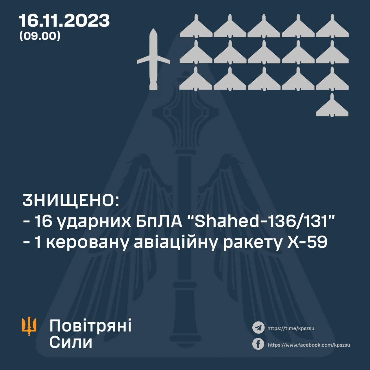 11.05 Воздушные силы публикуют отчет об утренней атаке "Шахедов". Из 18 дронов было сбито 16.