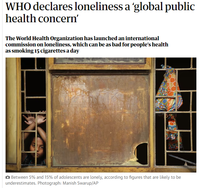 Всемирная организация здравоохранения (ВОЗ) объявила одиночество серьезной глобальной угрозой здоровью. Главный хирург США заявил, что его влияние на риск смертности эквивалентно курению 15 сигарет в день.