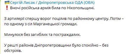 07.32 Ночью россиян ударили по Никопольщине Днепропетровской области из тяжелой артиллерии.