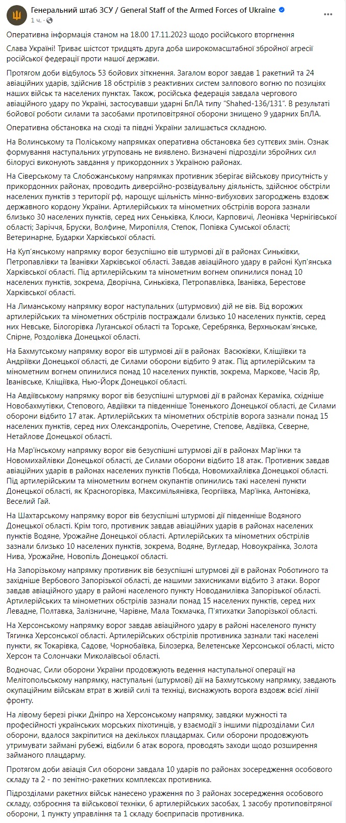 В пятницу, 17 ноября, в Украине идет 632-й день войны с Россией.