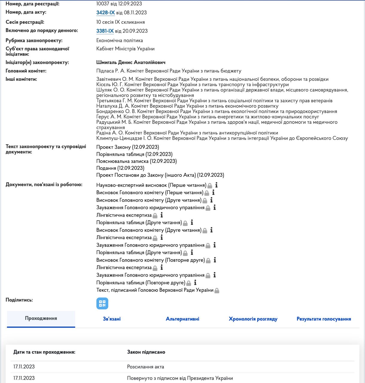 Об этом свидетельствует статус документа на сайте Верховной Рады.