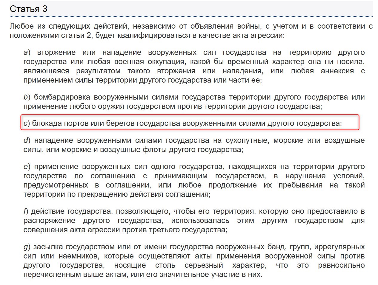 Отметим, что по международному праву морская блокада приравнивается к акту агрессии и может являться поводом для объявления войны. Ниже - статья 3 из резолюции 3314 (ХХIХ) Генеральной ассамблеи ООН от 14 декабря 1974 года, которой было утверждено определение агрессии.
