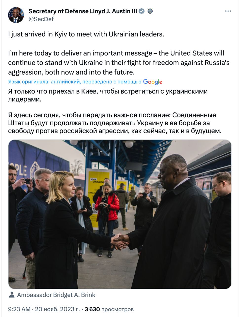 "Я только что приехал в Киев, чтобы встретиться с украинскими лидерами. Я здесь сегодня, чтобы передать важное послание: Соединенные Штаты будут продолжать поддерживать Украину в ее борьбе за свободу против российской агрессии, как сейчас, так и в будущем", - написал он.