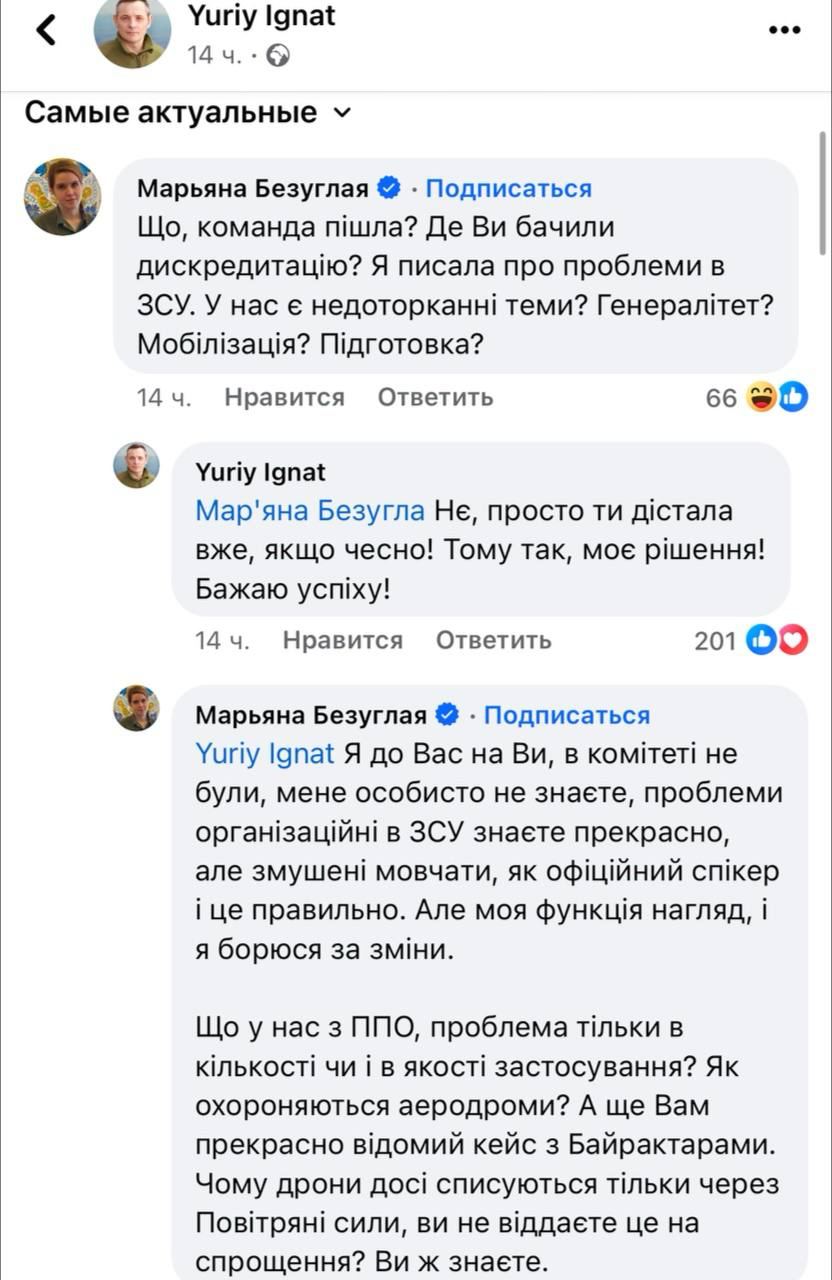 Безуглая пришла к нему в комментарии и обвинила спикера Воздушных сил в том, что он получил команду сверху.
