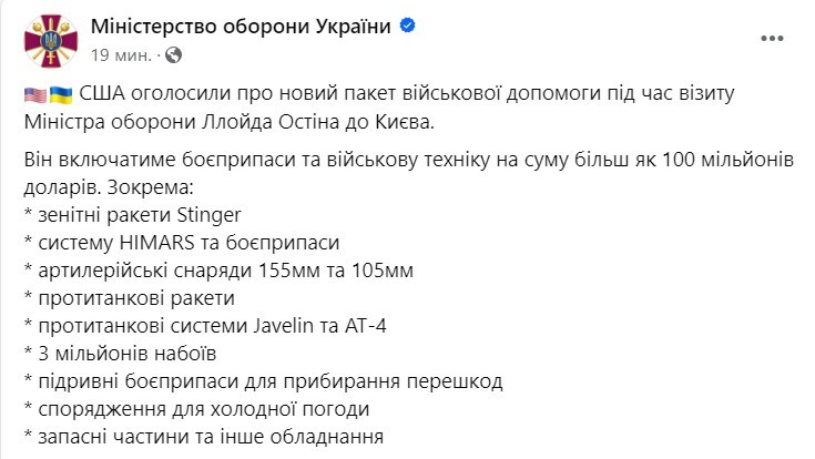 США выделяют новый пакет военной помощи Украине. Фото: Facebook