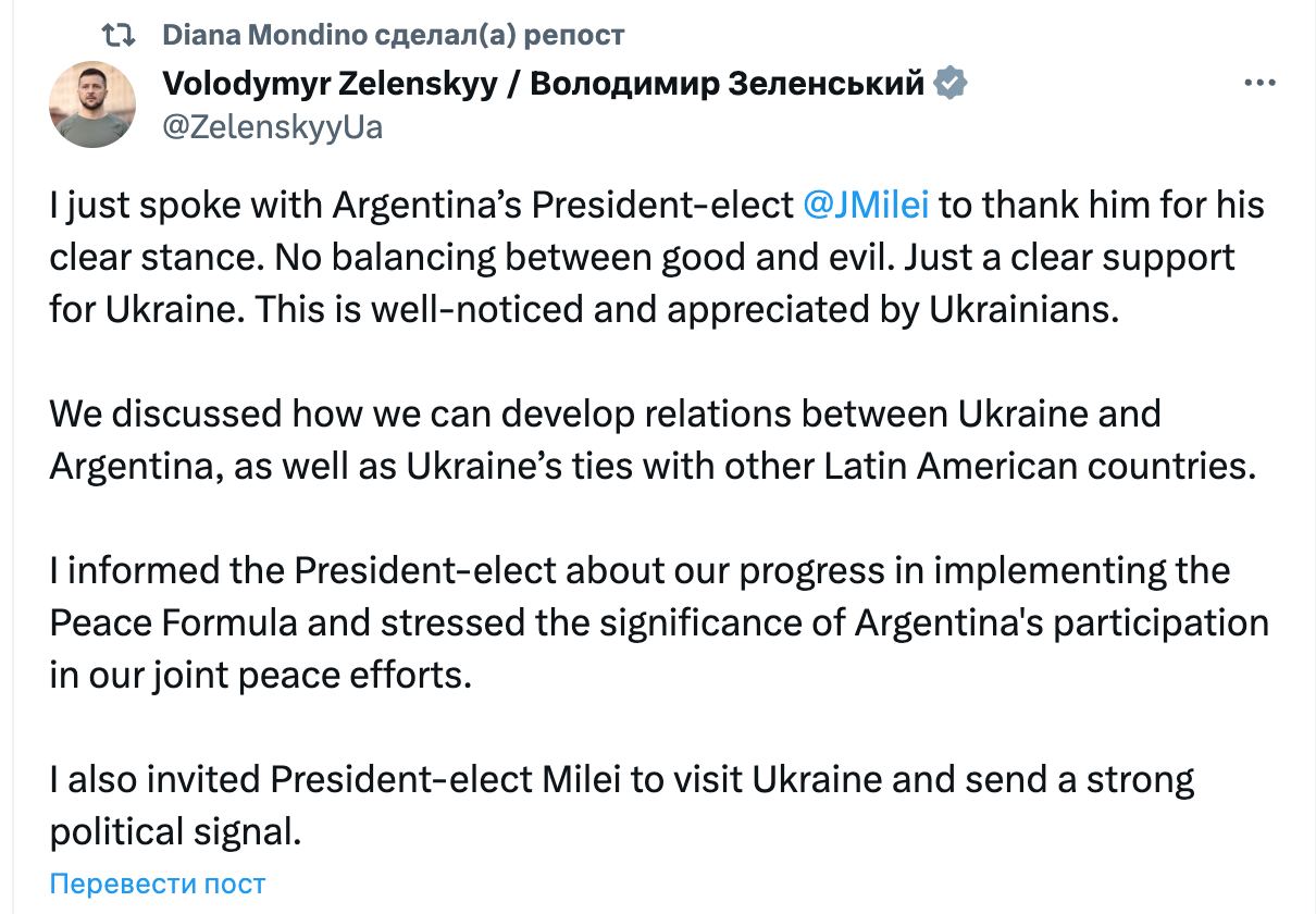 "Избранный президент провел телефонные переговоры с президентом Владимиром Зеленским и предложил, чтобы Аргентина провела конференцию между Латинской Америкой и Украиной", - говорится в сообщении.