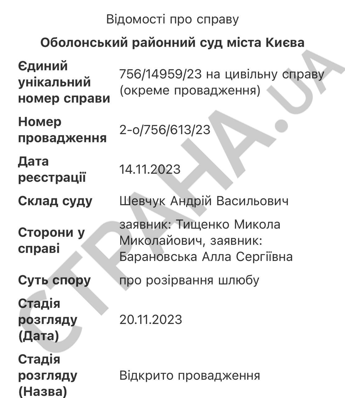Гражданское дело о расторжении брака зарегистрировано в Оболонском райсуде Киева 14 ноября.
