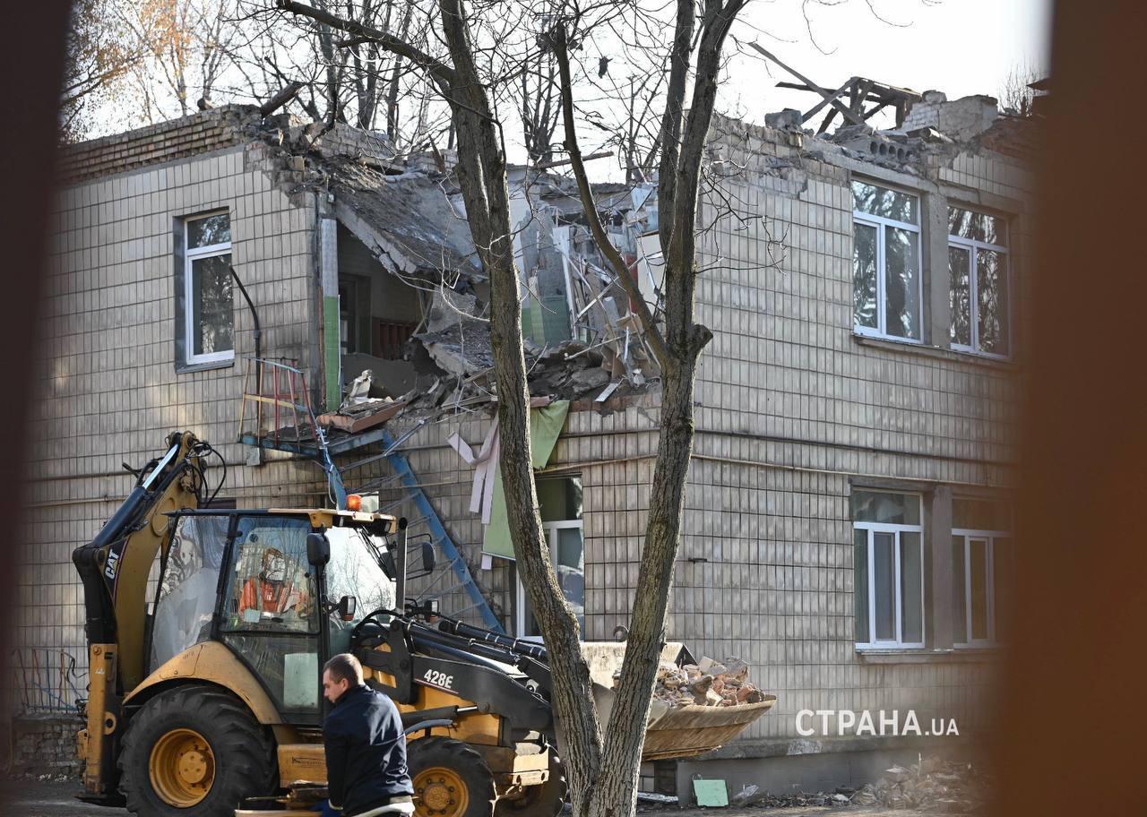 Здесь повреждено здание детского сада. Обвалилась часть крыши и стены на втором этаже.
