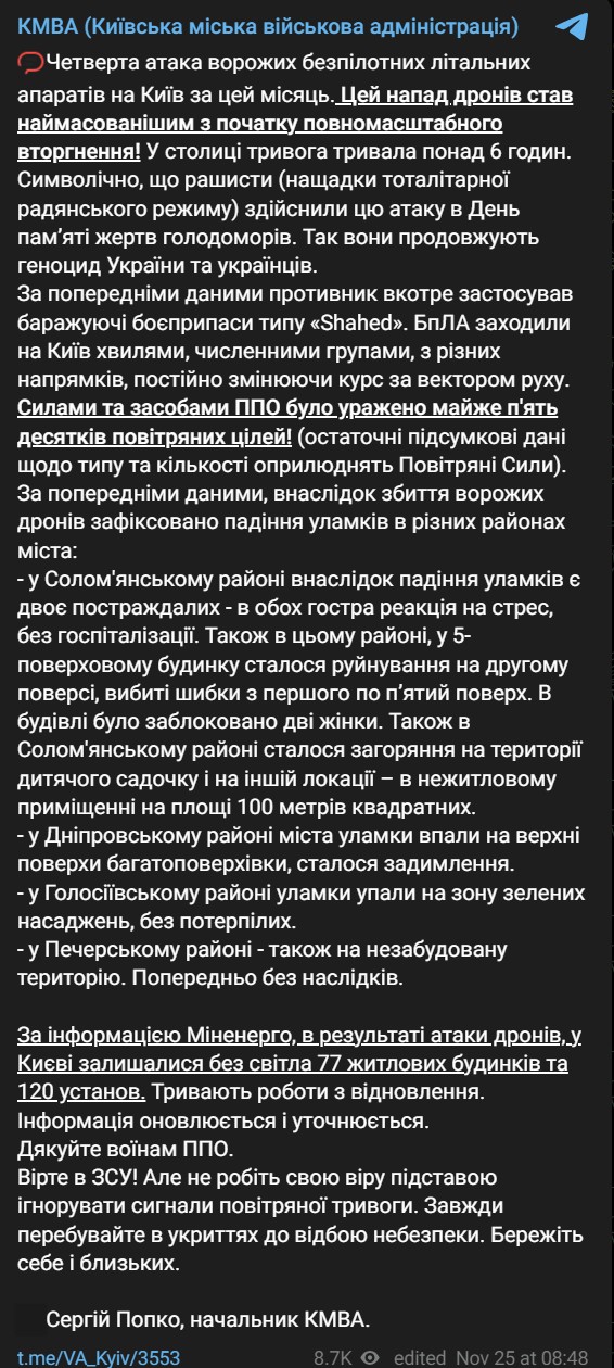 08:58 Предварительные итоги атаки беспилотников на Киев от городской военной администрации.