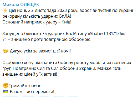 08:59 Ночью россияне выпустили по Украине рекордное число дронов - 75 единиц. 71 из них удалось сбить, заявил командующий Воздушных сил Олещук.