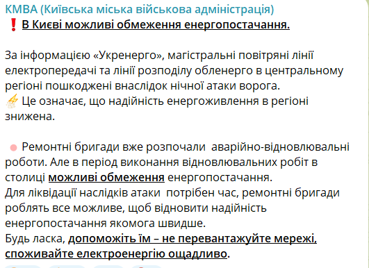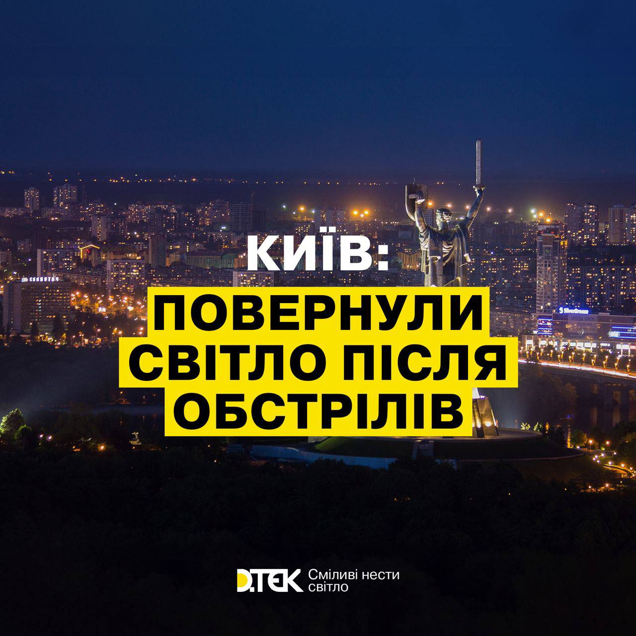 12:47 После ночного удара беспилотников в Киеве вернули электричество потребителям, у которых оно с утра пропало, сообщает ДТЭК.