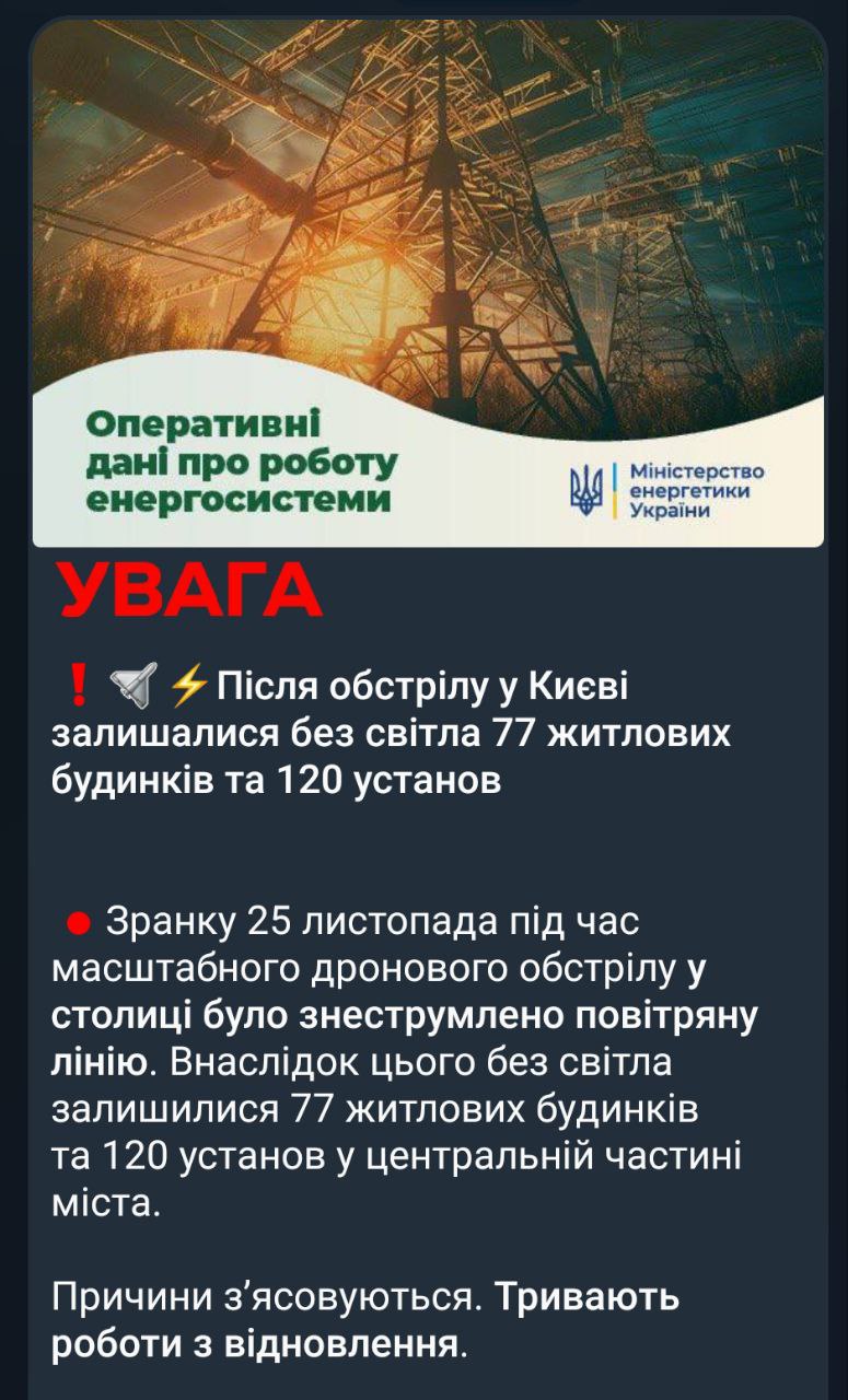 Также в администрации подтвердили, что 77 домов и 120 ведомств Киева остались без света.