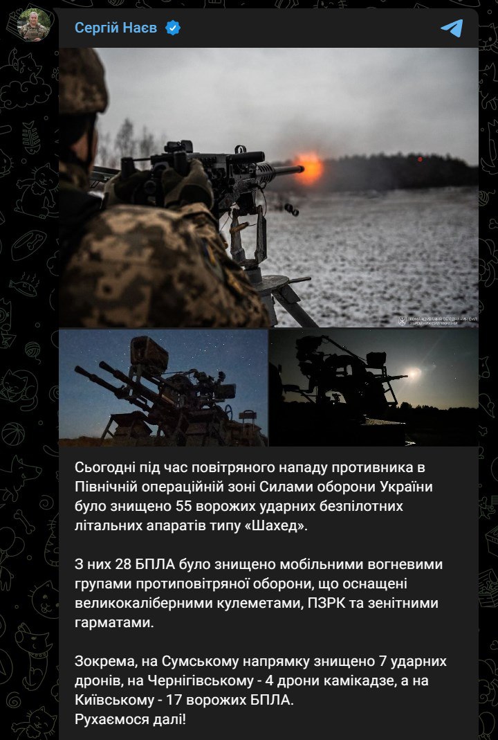 08:47 Сегодня в Северной операционной зоне было уничтожено 55 вражеских ударных беспилотников, заявил командующий Объединенных сил Наев.