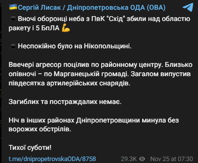 "Ночью защитники неба с ПвК "Восток" сбили над областью ракету и 5 БпЛА. Неспокойно было на Никопольщине. Вечером агрессор попал по районному центру. Около полуночи – по Марганецкому обществу. В общей сложности выпустив полдесятка артиллерийских снарядов", - сообщил Лысак
