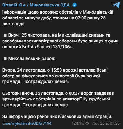 Также Ким сообщил, что в Николаевской области был уничтожен один вражеский БПЛА "Shahed-131/136.