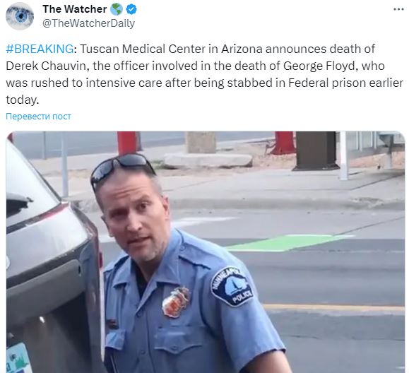 В США появилась информация, что умер полицейский Дерек Шовин, который отбывал срок за убийство афроамериканца Джорджа Флойда.