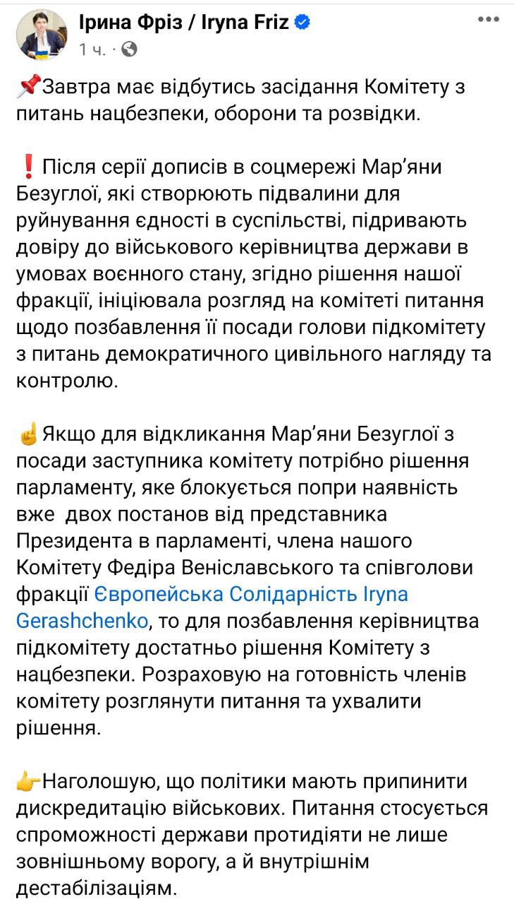 А Ирина Фриз (Евросолидарность) предлагает снять Безуглую и с должности главы подкомитета по вопросам демократического гражданского надзора и контроля.