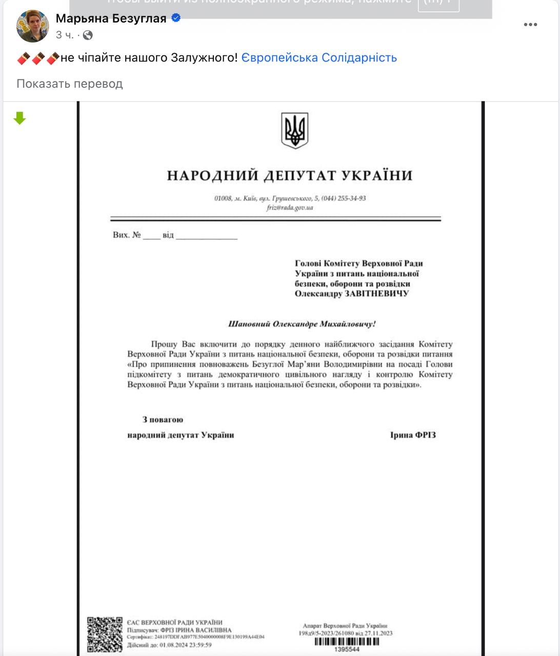 Напомним, после скандального поста Безуглой с призывом к отставке главкома ВСУ в Раде предложили снять нардепа с должности замглавы комитета нацбезопасности.