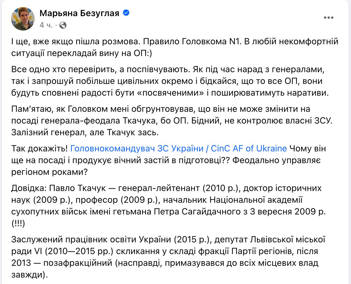 "Правило Главкома N1. В любой некомфортной ситуации перекладывай вину на ОП. Все равно кто проверит, а посочувствуют. Как во время совещаний с генералами, так и приглашай побольше гражданских отдельно и жалуйся, что это все ОП, они будут исполнены радости быть "посвящёнными" и распространять нарративы. Помню, как Главком мне доказывал, что он не может сменить в должности генерала-феодала Ткачука, потому что ОП. Бедный, не контролирует собственные ВСУ. Железный генерал, но Ткачук нельзя", - пишет Безуглая.
