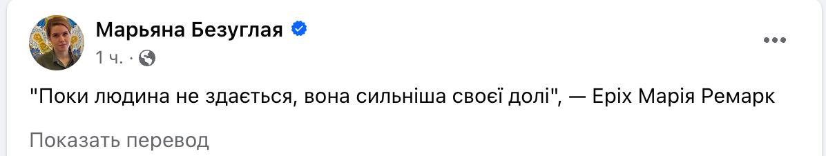 И закончила серию публикаций цитатой Эрих Мария Ремарк: "Пока человек не сдается, он сильнее своей судьбы". Некоторые пользователи после этого уже переиначили фамилию писателя: "Эрих Марьяна Ремарк".