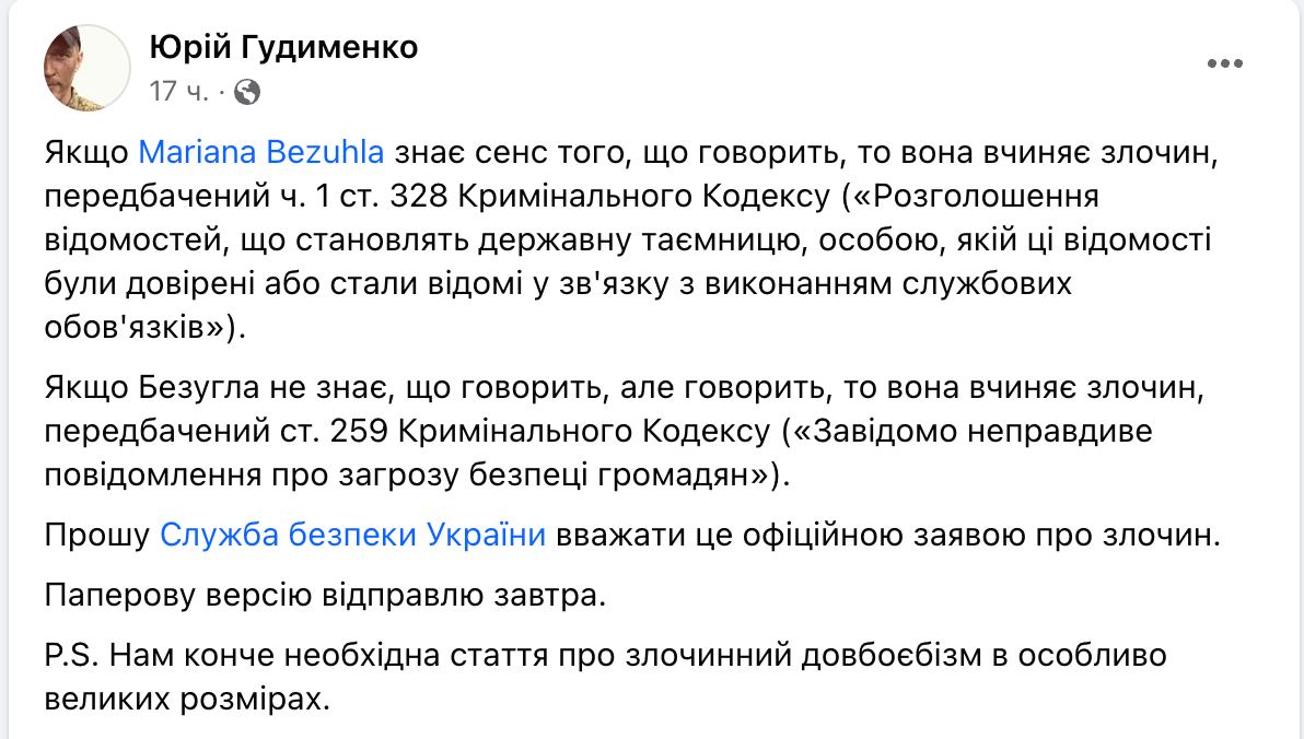 Тем временем на саму Безуглую уже подали заявление в СБУ за ее заявления против Залужного. Это сделал один из лидеров партии "Демократическая сокира" Юрий Гудименко.