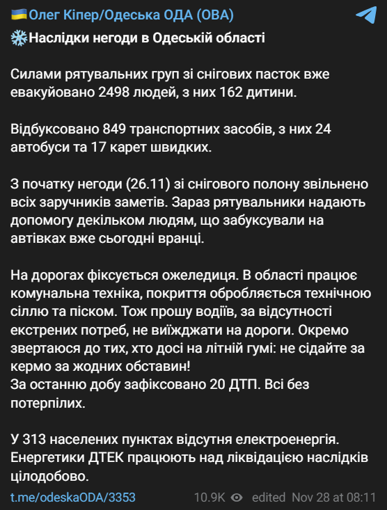 Из Одесской области уже эвакуировали 2498 человек, из них 162 ребенка. В 313 населённых пунктах отсутствует электроэнергия.