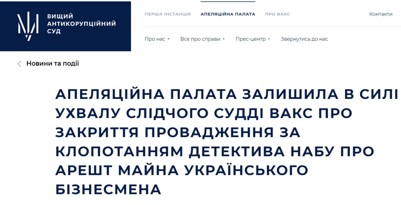 "Апелляционная палата Высшего антикоррупционного суда 27 ноября 2023 года рассмотрела апелляционную жалобу стороны обвинения на определение следственного судьи ВАКС от 21 сентября 2023 года о закрытии производства по ходатайству детектива НАБУ об аресте имущества бывшего заместителя руководителя департамента АО КБ "ПриватБанк". Лицо подозревается в совершении уголовного правонарушения, предусмотренного ч.5 ст.191; ч. 3 ст. 209 УК Украины. По результатам рассмотрения коллегия судей оставила без удовлетворения апелляционную жалобу стороны обвинения, а определение следователя судьи ВАКС без изменений. Решение было принято с отдельным мнением судьи Николая Глотова. Решение вступило в законную силу с момента провозглашения и обжалования в кассационном порядке не подлежит", - сказано в сообщении.