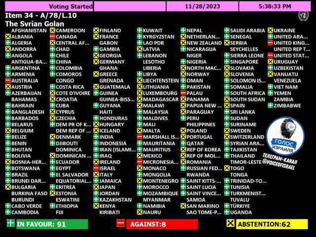Против принятия документа выступили восемь стран: Израиль, США, Великобритания, Микронезия, Палау, Австралия, Канада и Маршалловы острова.